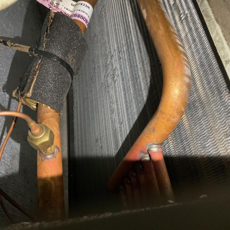 Solace Heating and Air inspected an AC unit in Nashville, Tennessee that was not cooling. Technicians found a major refrigerant leak at the evaporator coil caused by a previous installation. They documented the issue with photos and video and shared repair details with the office for communication with the property management firm.