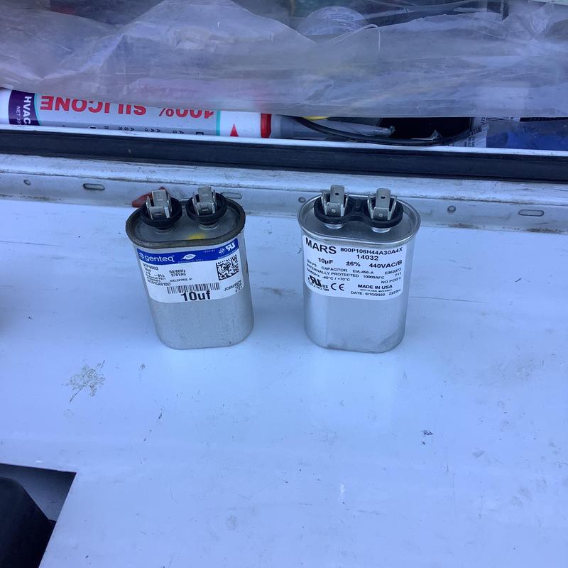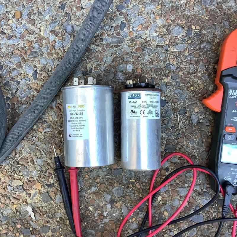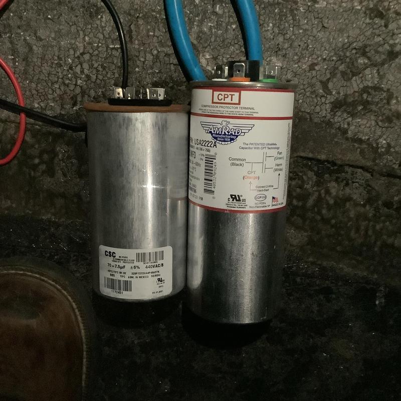 A technician in Olive Branch, Mississippi replaced a failed dual run 405 capacitor on the compressor side of an HVAC unit. After the replacement, the system resumed normal operation and cooling performance.