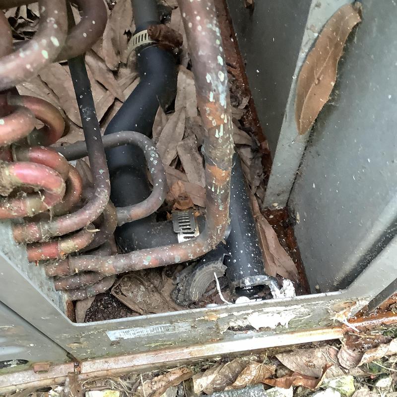 Solace Heating and Air inspected an HVAC system in Germantown, Tennessee. The technician identified a refrigerant leak, corrosion in the evaporator coil, damaged fins on the outdoor coil, and a weak compressor. Due to extensive issues and outdated R22 refrigerant use, the technician recommended a full system replacement.