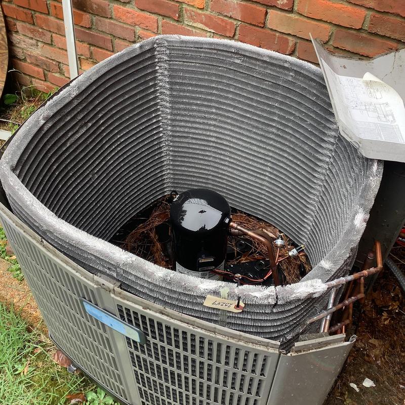 Solace Heating and Air replaced a leaking condenser coil and faulty capacitor on an HVAC unit in Bartlett, Tennessee. After installing the new parts, they performed a pressure test and vacuum pull. The system now operates correctly and provides normal cooling.