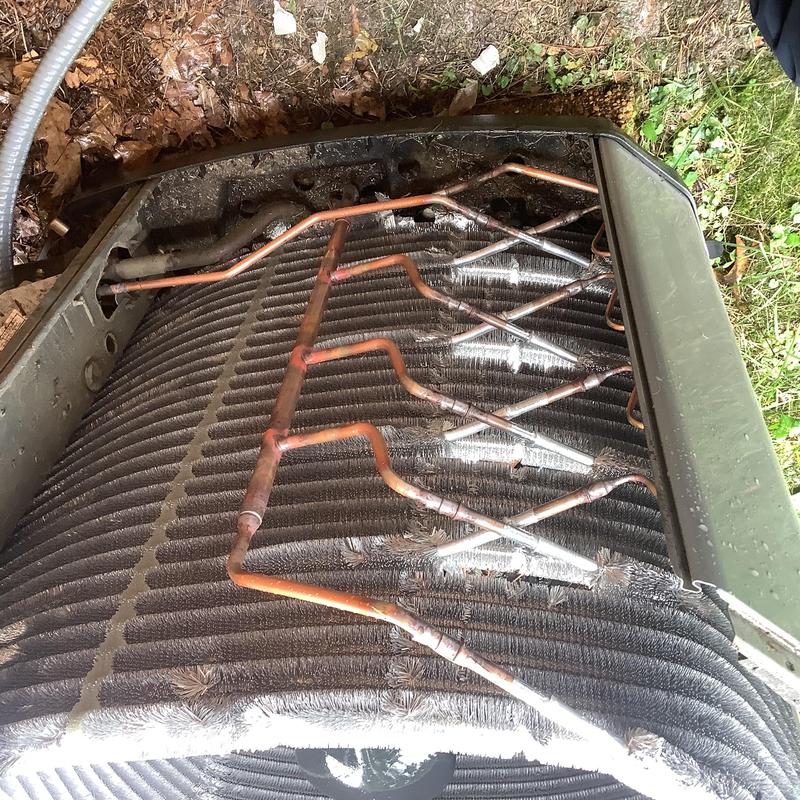 A technician in Atoka, Tennessee repaired a damaged copper line set on an outdoor AC unit after improper welding caused significant leaks. The system was restored to factory specifications and is now working properly.
