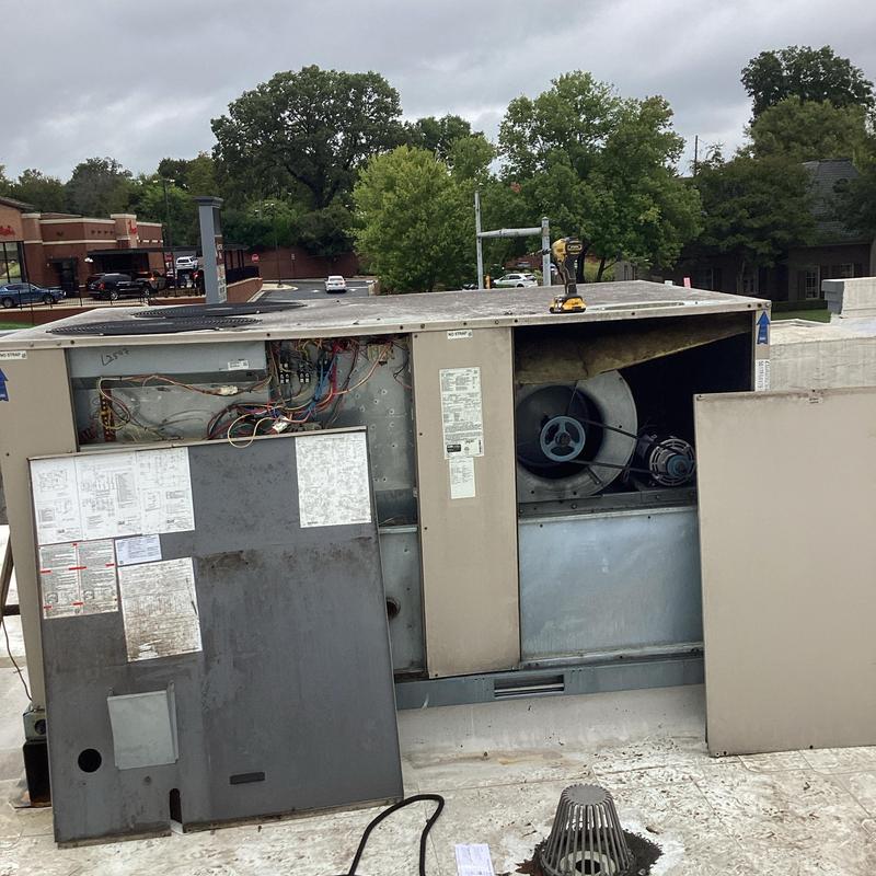 Solace Heating and Air replaced a 2-horsepower motor on a 12.5-ton rooftop HVAC unit in Memphis, Tennessee. After installation, the system started without issues and restored cooling to the building.