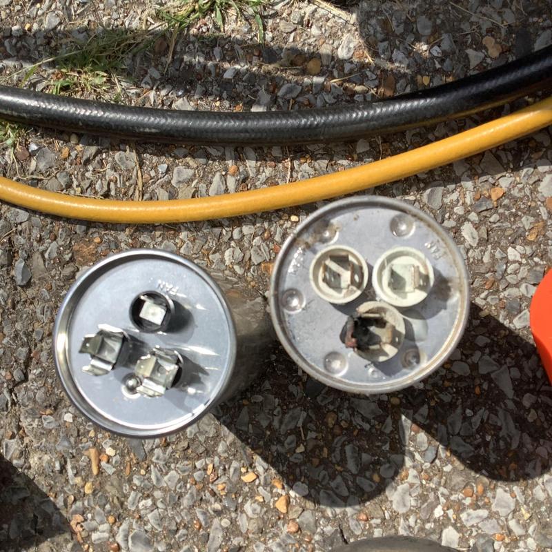 A technician in Olive Branch, Mississippi replaced a failed dual run 405 capacitor on the compressor side of an HVAC unit. After the replacement, the system resumed normal operation and cooling performance.
