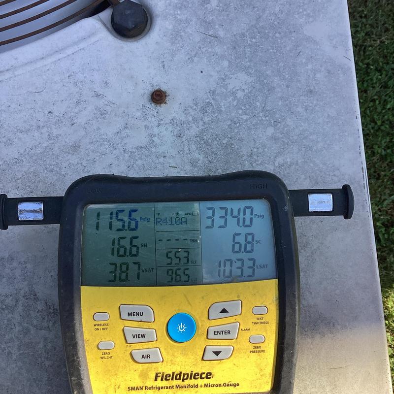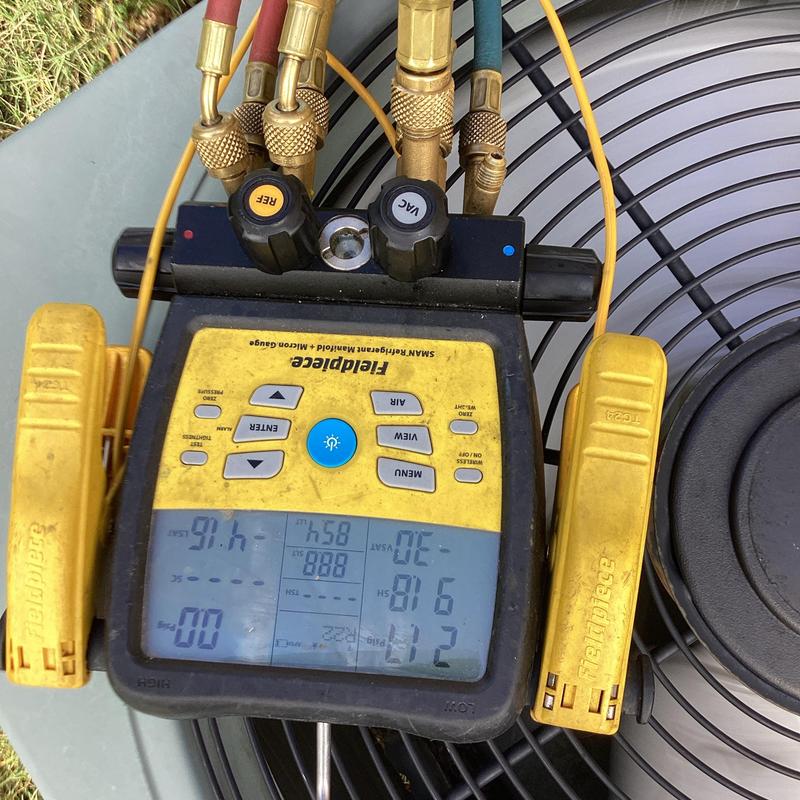 A technician from Solace Heating and Air added 1LB of R410a refrigerant to an air conditioning system in Bartlett, Tennessee. The system was low due to a leak in the evaporator coil. The homeowner chose to refill the refrigerant rather than repair or replace the coil. The system is now cooling properly.