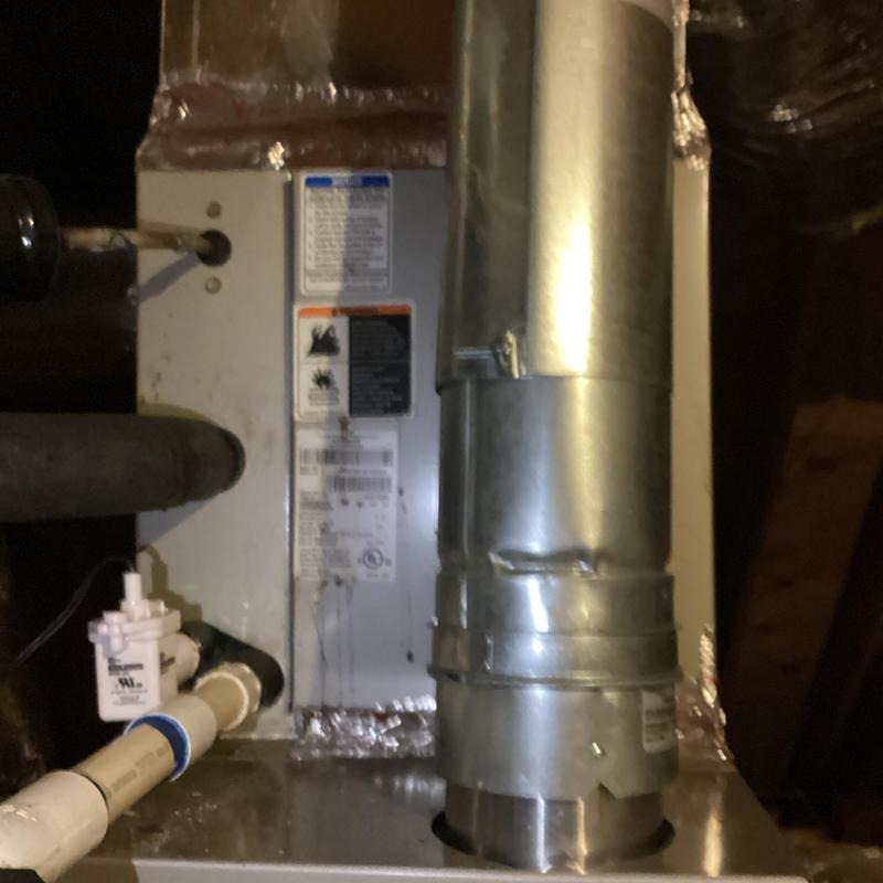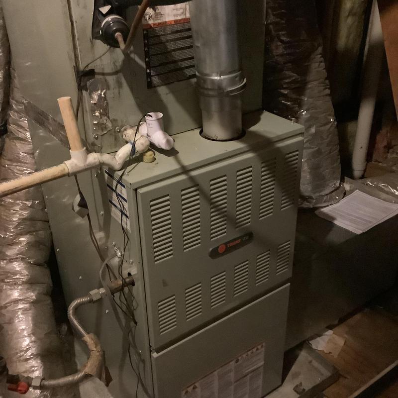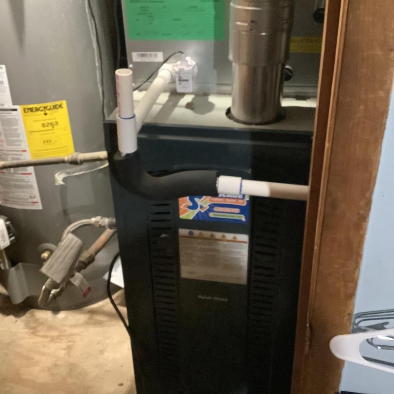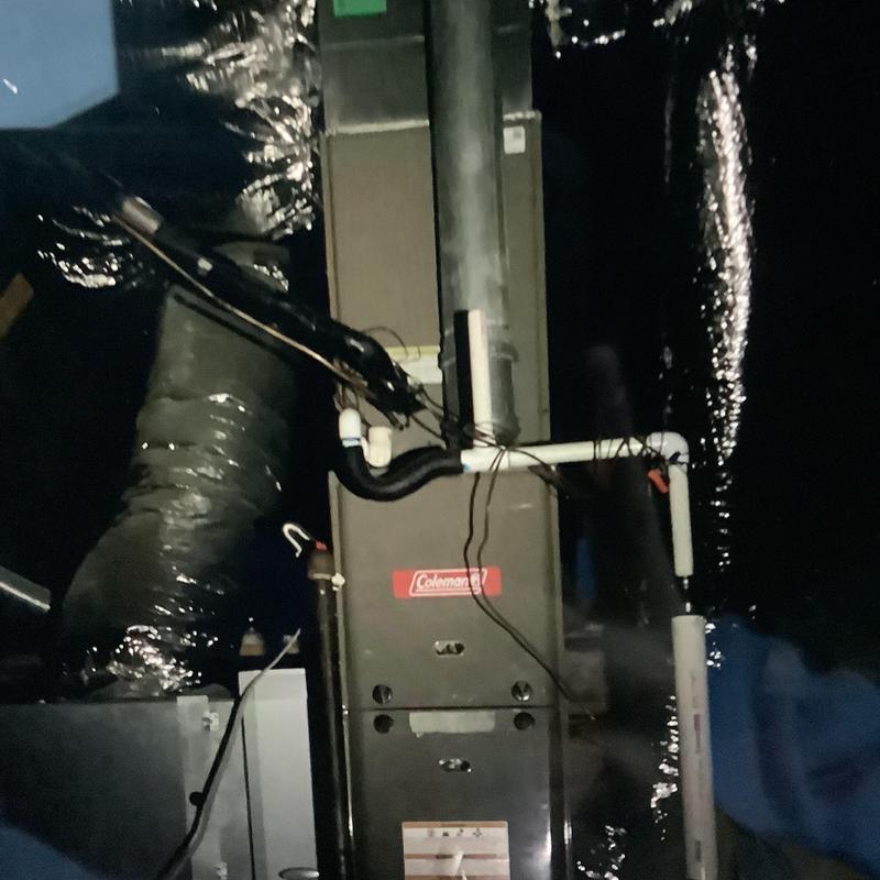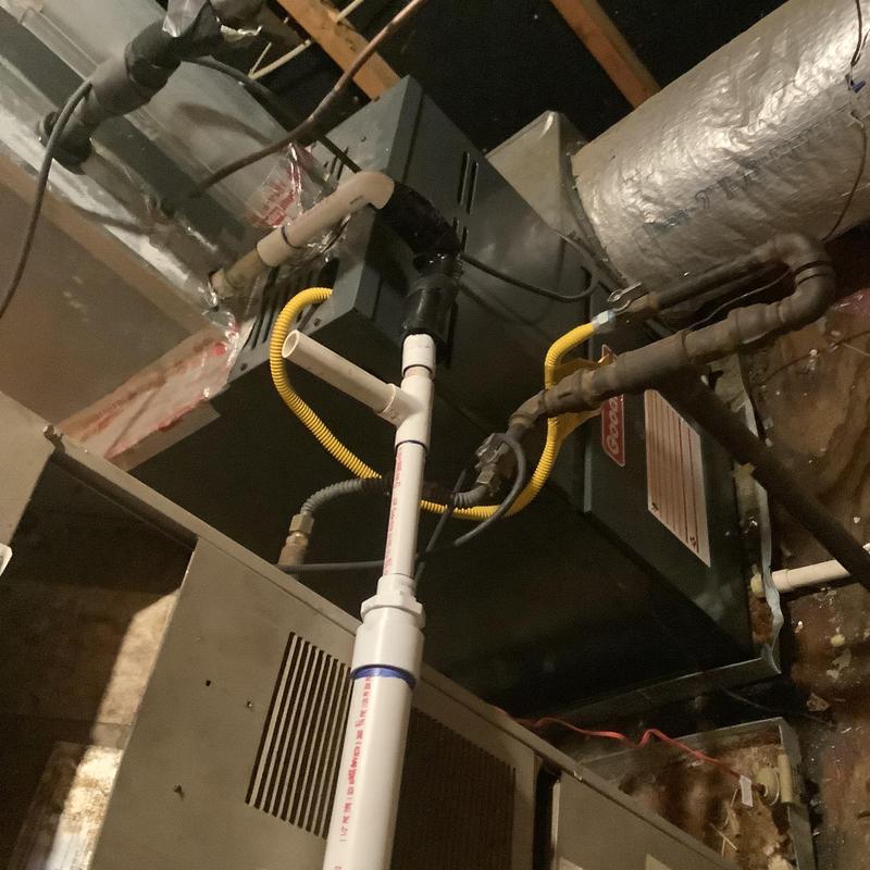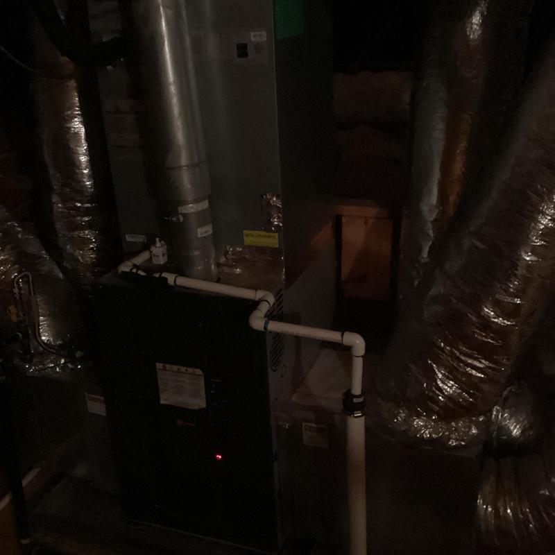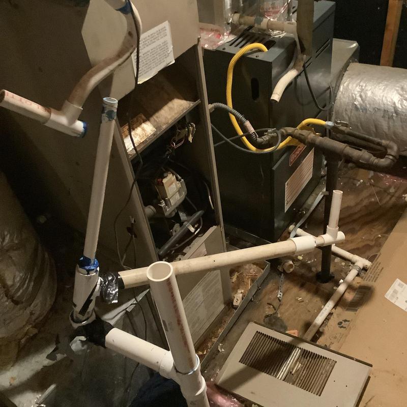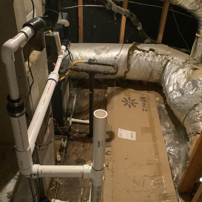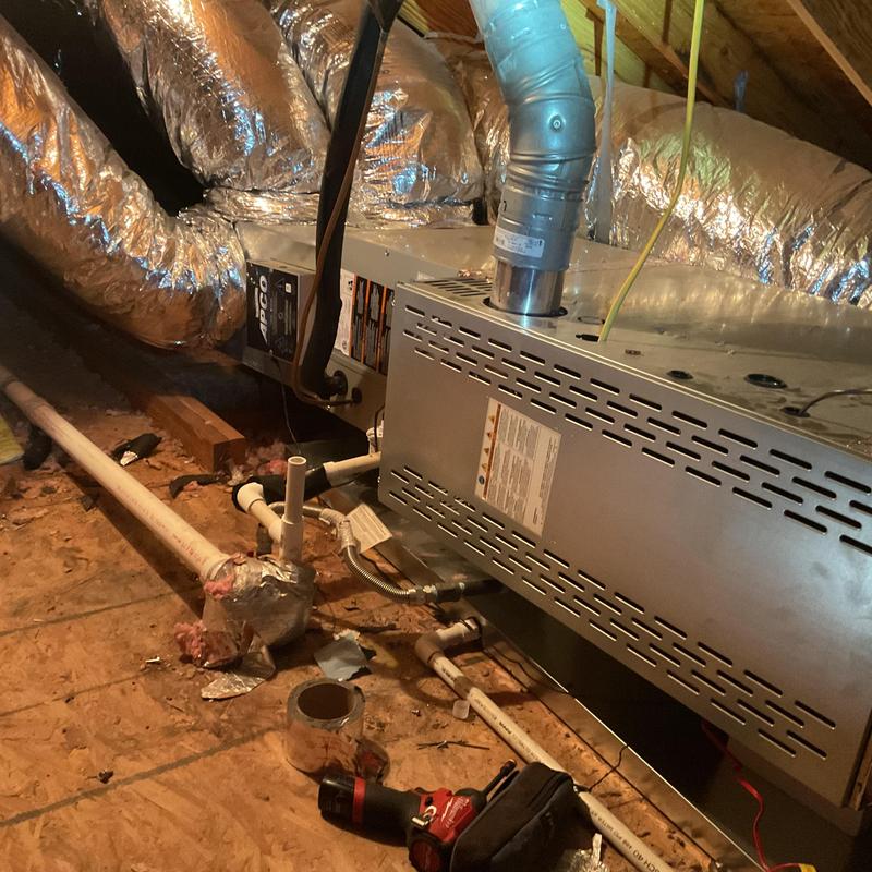 A technician in Bartlett, Tennessee inspected an upstairs HVAC system with a full drain pan. They identified a disconnected vent pipe and replaced faulty flue sections. After securing the connections and conducting a carbon monoxide test, they restored normal heating. A plumber was called to address a possible blockage further in the drain line.