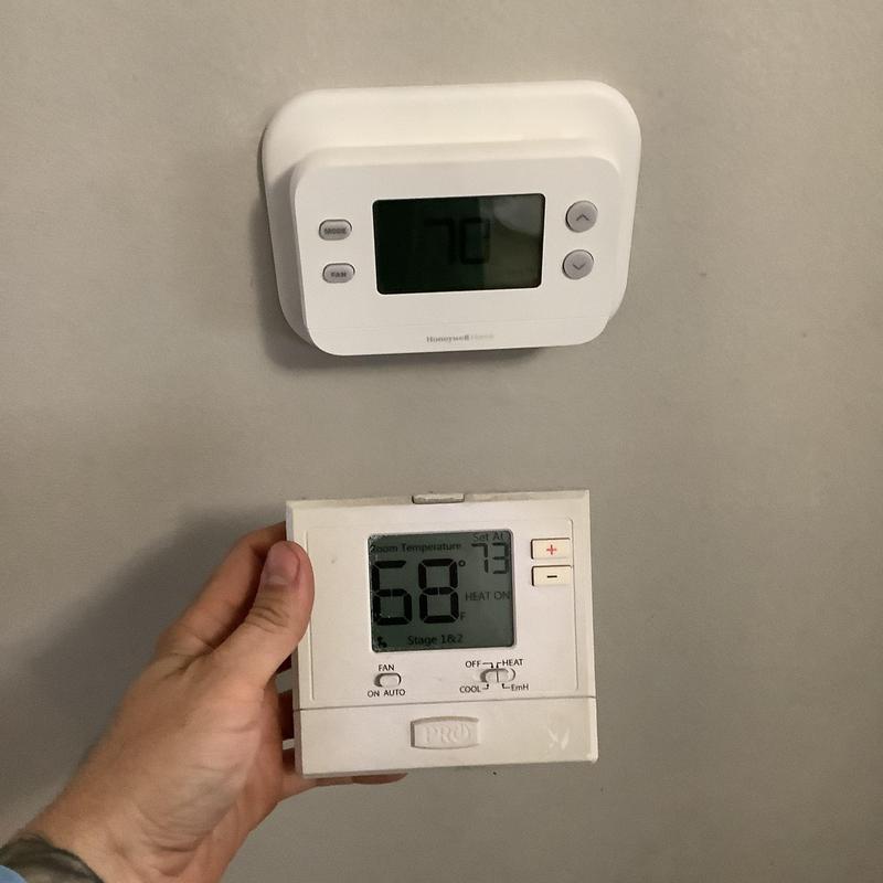 Solace Heating and Air replaced a faulty thermostat with a new T701 in Memphis, Tennessee. The technician tested the HVAC system, verified all electrical components met manufacturer specifications, and confirmed normal heating operation after the repair.