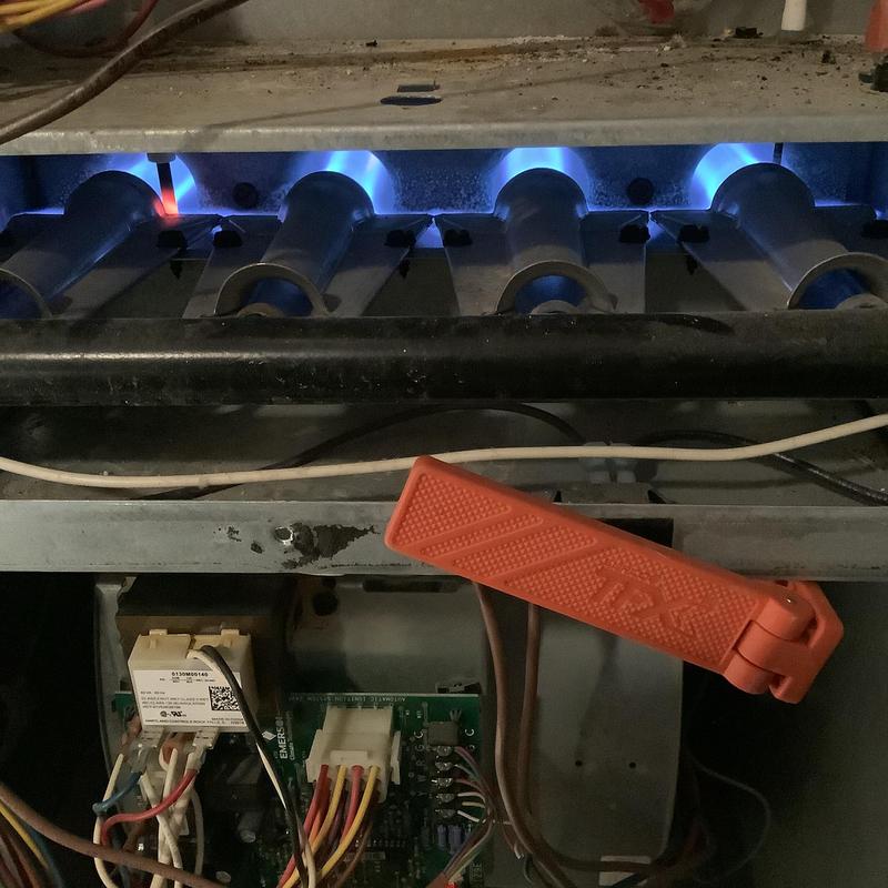 A technician in Bartlett, Tennessee replaced a broken flame roll-out switch in a heating system. After installing the new switch, they tested the unit and confirmed it is now operating and heating normally.