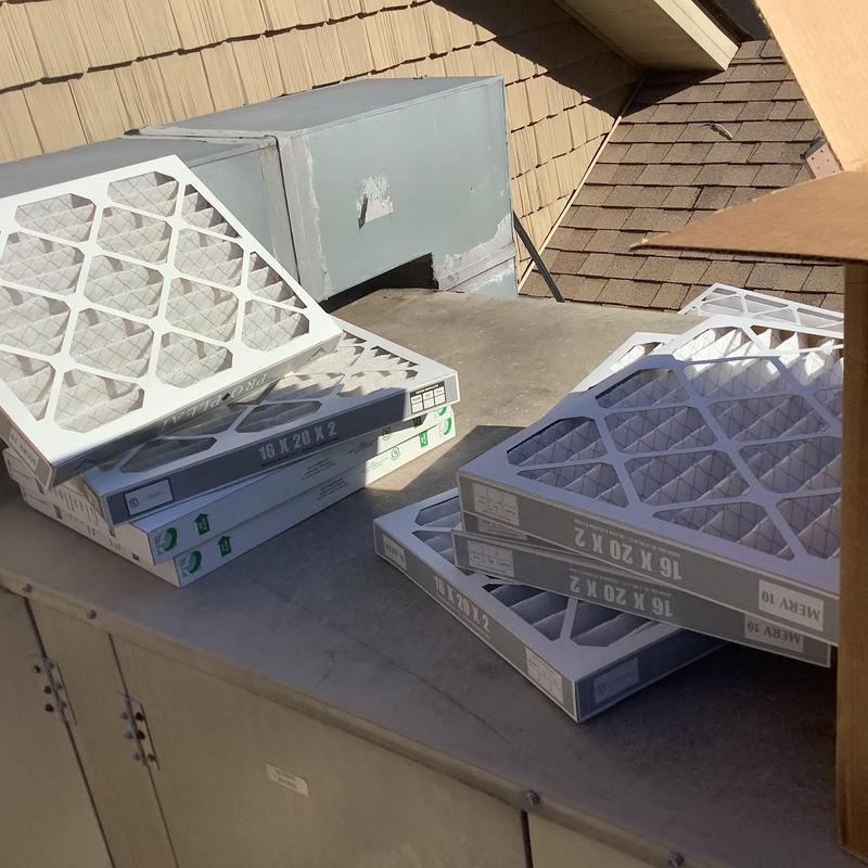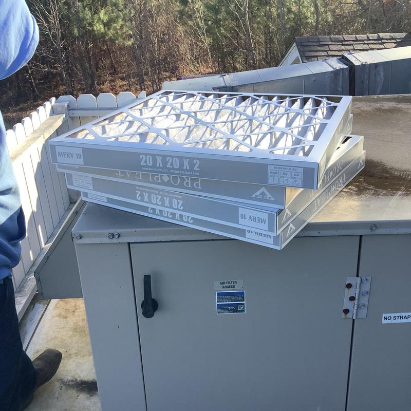 Solace Heating and Air performed quarterly commercial RTU filter changing in Bartlett, Tennessee. Technicians replaced rooftop unit filters to maintain HVAC efficiency and indoor air quality for the facility.