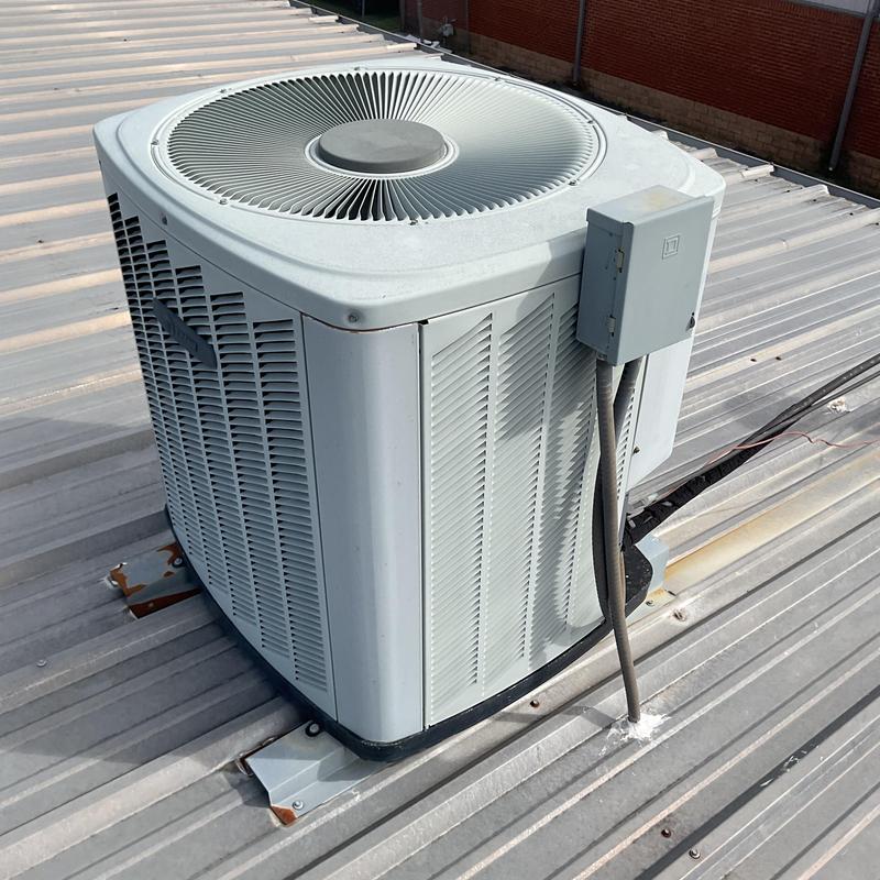 Solace Heating and Air serviced or installed a rooftop HVAC unit in Charleston, SC. The work included securing the air conditioning condenser unit on metal supports and connecting electrical wiring through a conduit to a mounted disconnect box. The unit appears properly mounted and ready for operation.