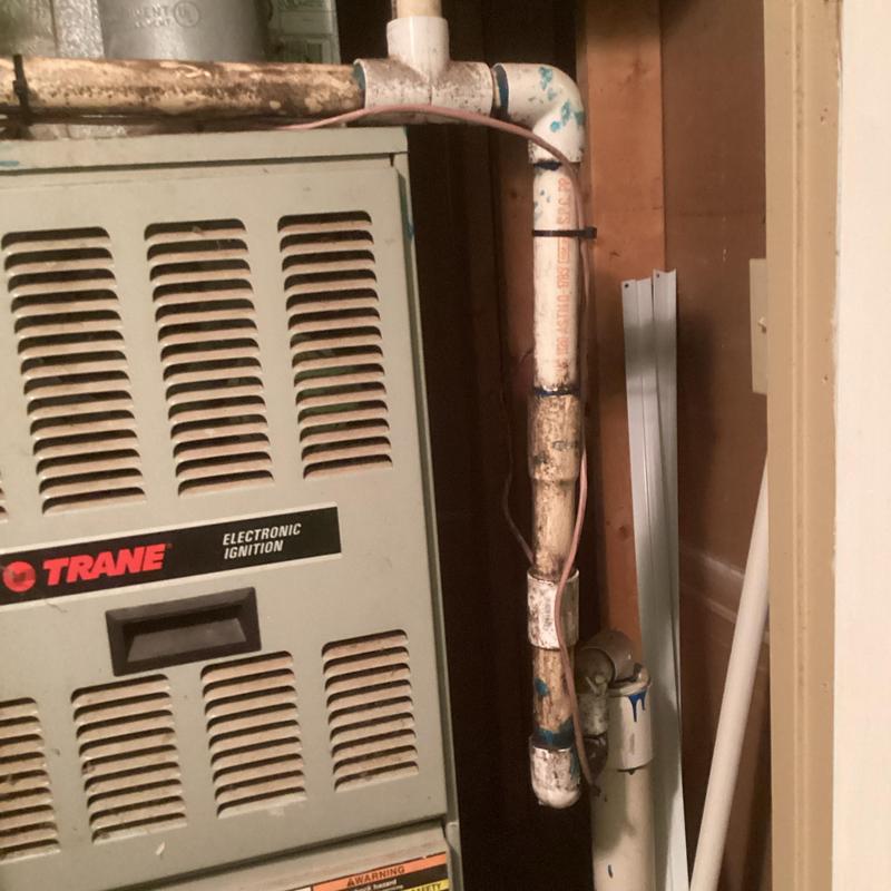 A technician in Bartlett, Tennessee inspected an upstairs HVAC system with a full drain pan. They identified a disconnected vent pipe and replaced faulty flue sections. After securing the connections and conducting a carbon monoxide test, they restored normal heating. A plumber was called to address a possible blockage further in the drain line.