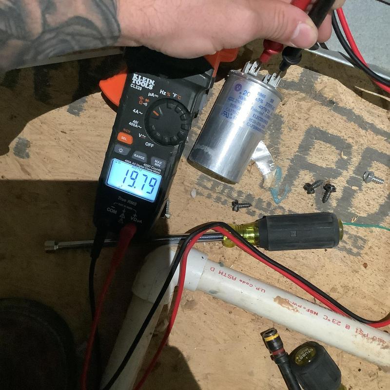 Solace Heating and Air replaced a faulty blower capacitor in a closet HVAC unit in Germantown, Tennessee. Technicians confirmed the capacitor was below specification at 7.64 mfd instead of 10 mfd. They inspected the blower wheel, filters, and coil, confirming all were clean. The unit is now operating and heating normally.