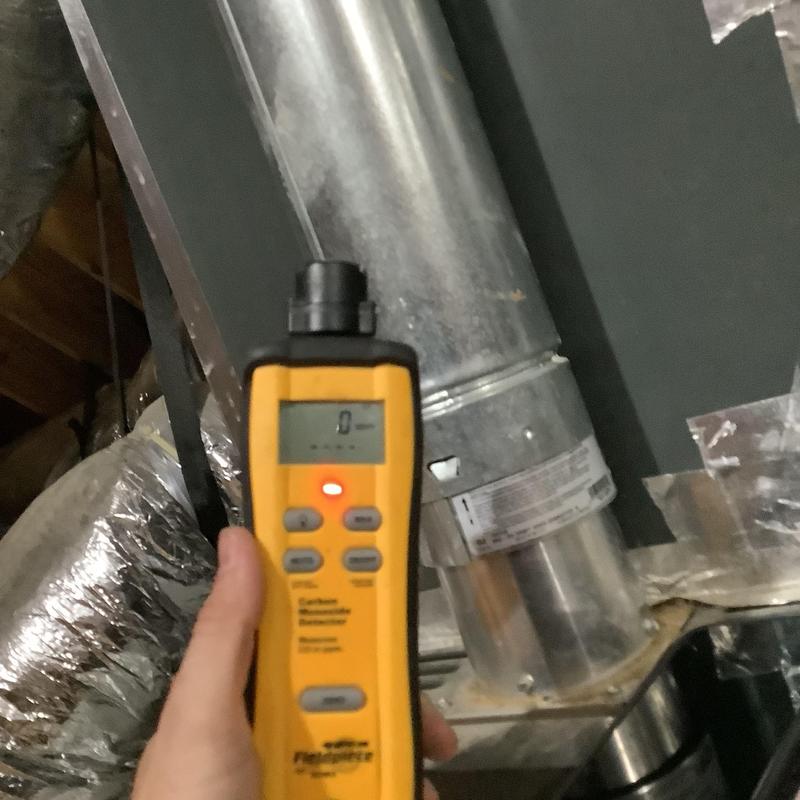 A technician in Bartlett, Tennessee inspected an upstairs HVAC system with a full drain pan. They identified a disconnected vent pipe and replaced faulty flue sections. After securing the connections and conducting a carbon monoxide test, they restored normal heating. A plumber was called to address a possible blockage further in the drain line.